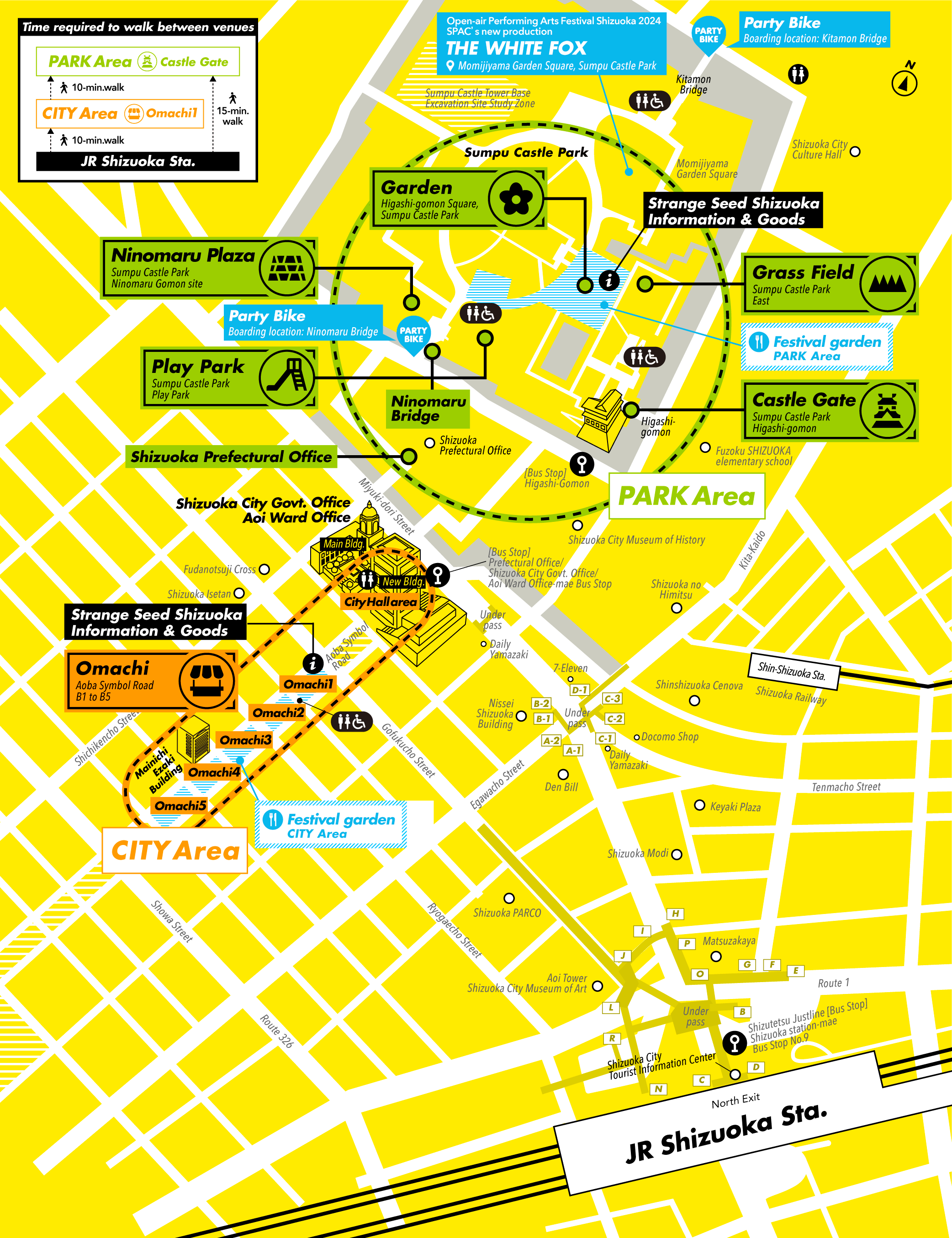 - 5 min. by Sumpu Roman Bus from JR Shizuoka Station (North Exit Bus Platform #10 Get off at Higashi Gomon)