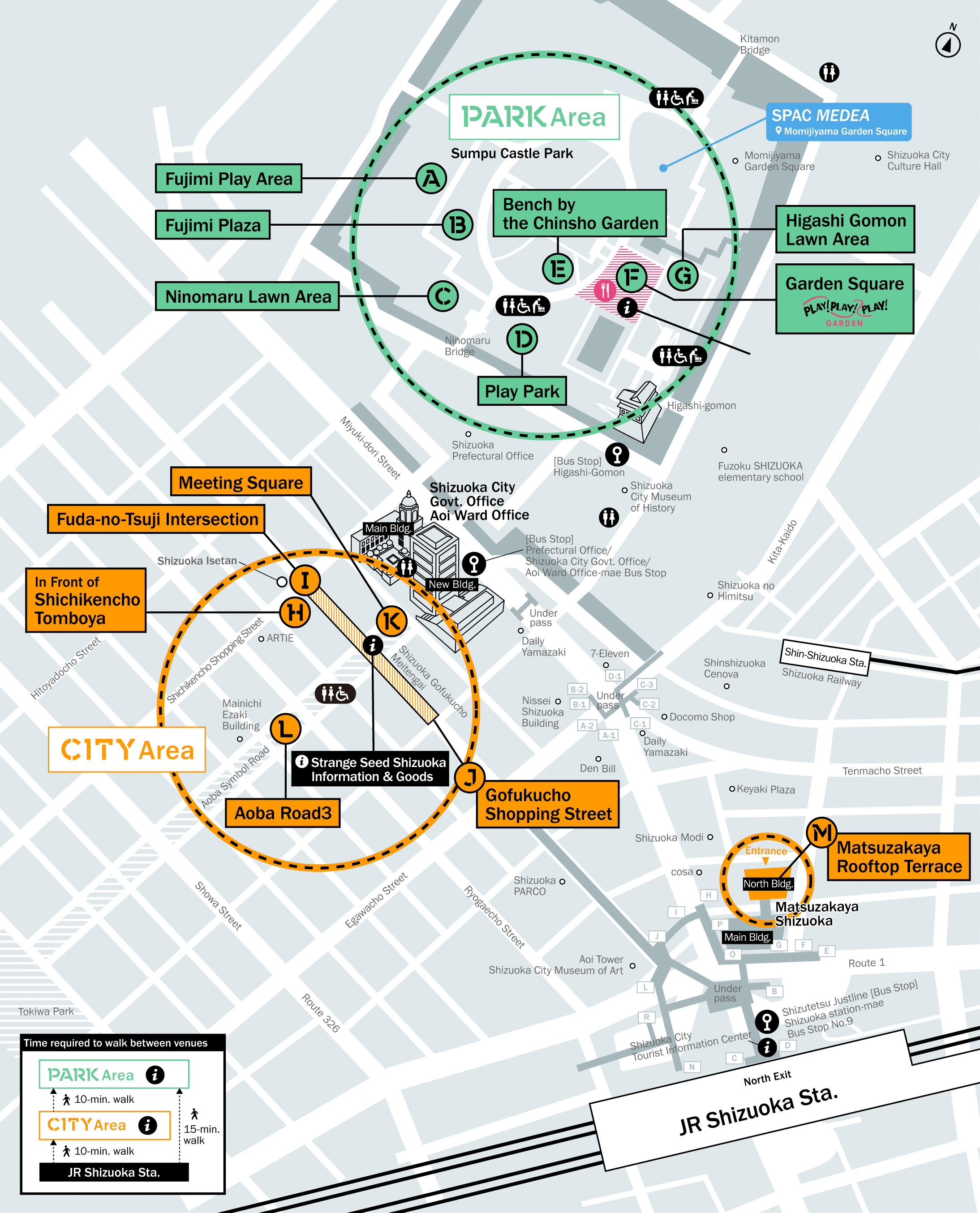 – Get off at Shizutetsu Just Line Bus “Kencho/Shizuoka City Hall Aoi Kuyakusho-mae”. About 5-minute walk from Bus stop.