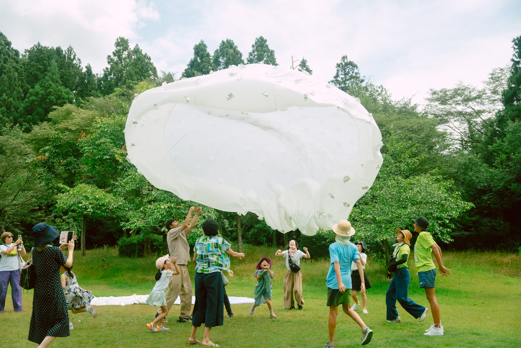 ペチャンコだった白い布が、空気と風と参加者の協力で空を舞います。